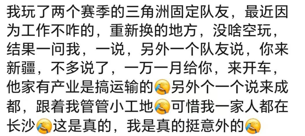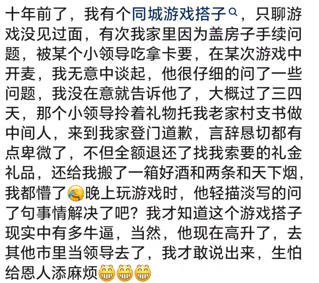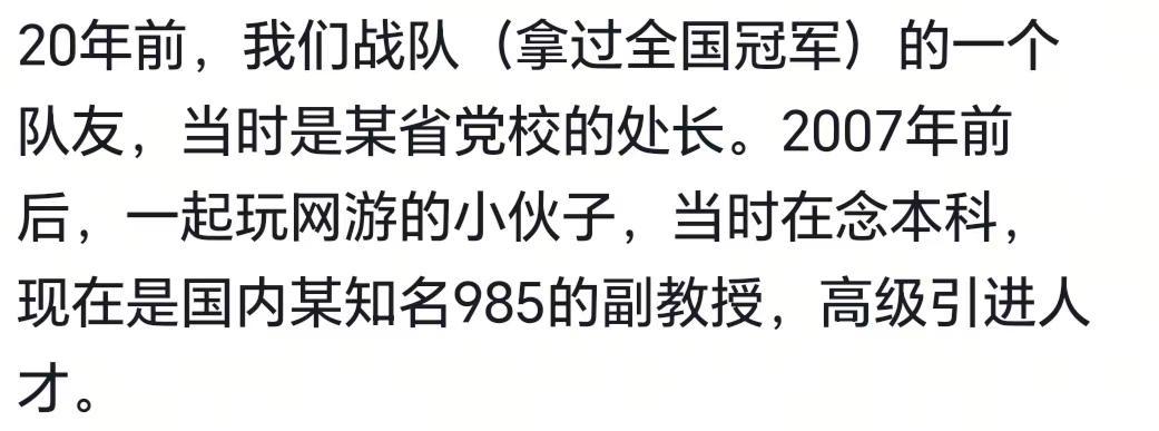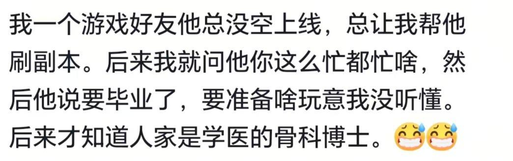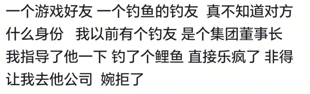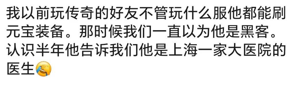 你永远不知道游戏里队友的现实职业有多离谱!我队友也是几位大神级得,有外国的,还有一个是政界一个大佬,一个每天全世界旅游的一个大哥。我玩魔兽认识一个北京的朋友,后来才知道他是省厅的处长正常的,以前玩网游也是的,后面才知道行会会长是一个地产公司老总游戏的,还有钓鱼佬,背后都有大佬当年玩梦幻的时候,我队友是人大的退休教授,一边带孙子一边玩游戏我的王者队友,一个开厂...