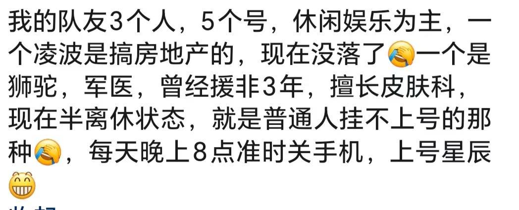 我队友也是几位大神级得,有外国的,还有一个是政界一个大佬,一个每天全世界旅游的一个大哥。