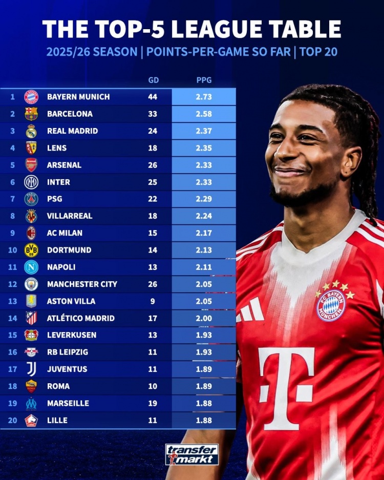 1月9日讯 《转会市场》统计了本赛季五大联赛球队场均拿分情况,拜仁、巴萨、皇马分列前三。